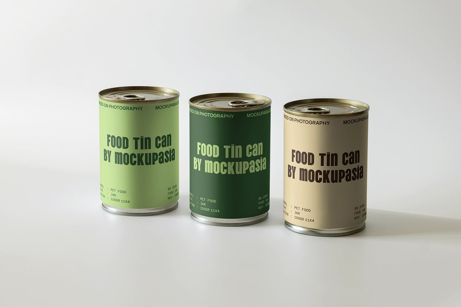 Showcase your pet food packaging designs with the Pet Food Can Mockup PF06 – a clean and versatile scene featuring three 150g metal cans displayed at an elegant angle on a pure white background. The minimal, bright setting makes it suitable for a wide range of products, from canned cat and dog food to other FMCG and industrial food items. The realistic lighting and accurate proportions ensure your label designs look sharp and professional in any presentation.