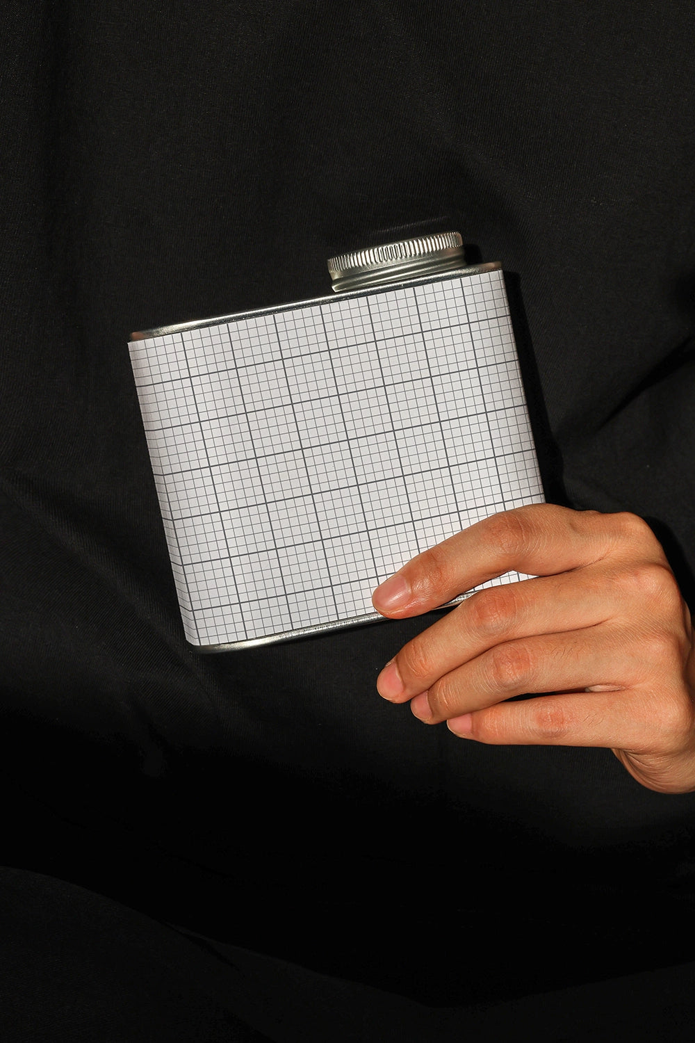 Capture attention with Coffee Tin Mockup #4, a high-impact scene featuring a hand-held cylindrical coffee tin contrasted against a dark outfit. This realistic mockup introduces human presence and texture, adding depth and context to your packaging design. Perfect for coffee brands seeking an authentic, lifestyle-oriented visual.