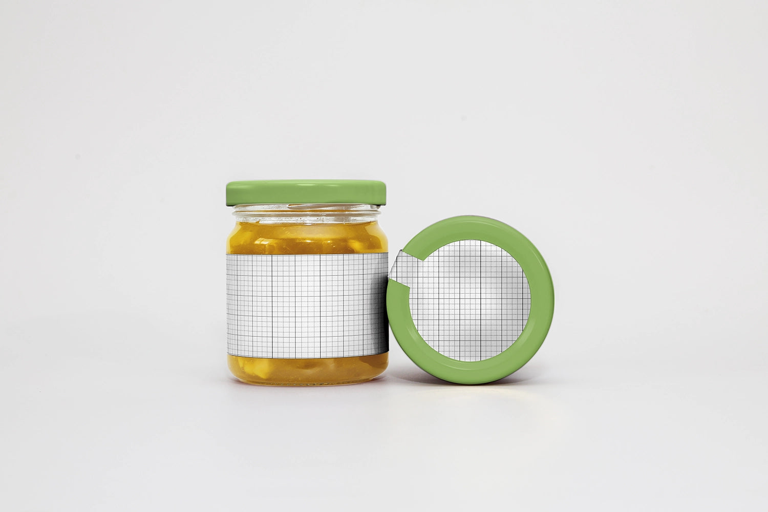 Showcase your branding designs with the Jam Jar Mockup JJ01 – featuring two jars of jam that can be fully customized. This mockup allows you to change the jam color, lid color, and apply your own label design with ease. One jar is displayed in front view to highlight your label, while the other is shown in top view with a round label for a complete presentation. Perfect for food, packaging, and product branding projects.
