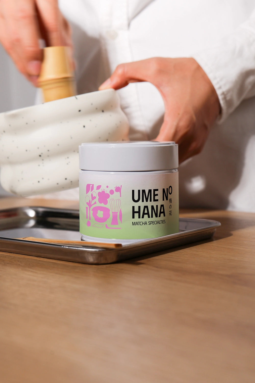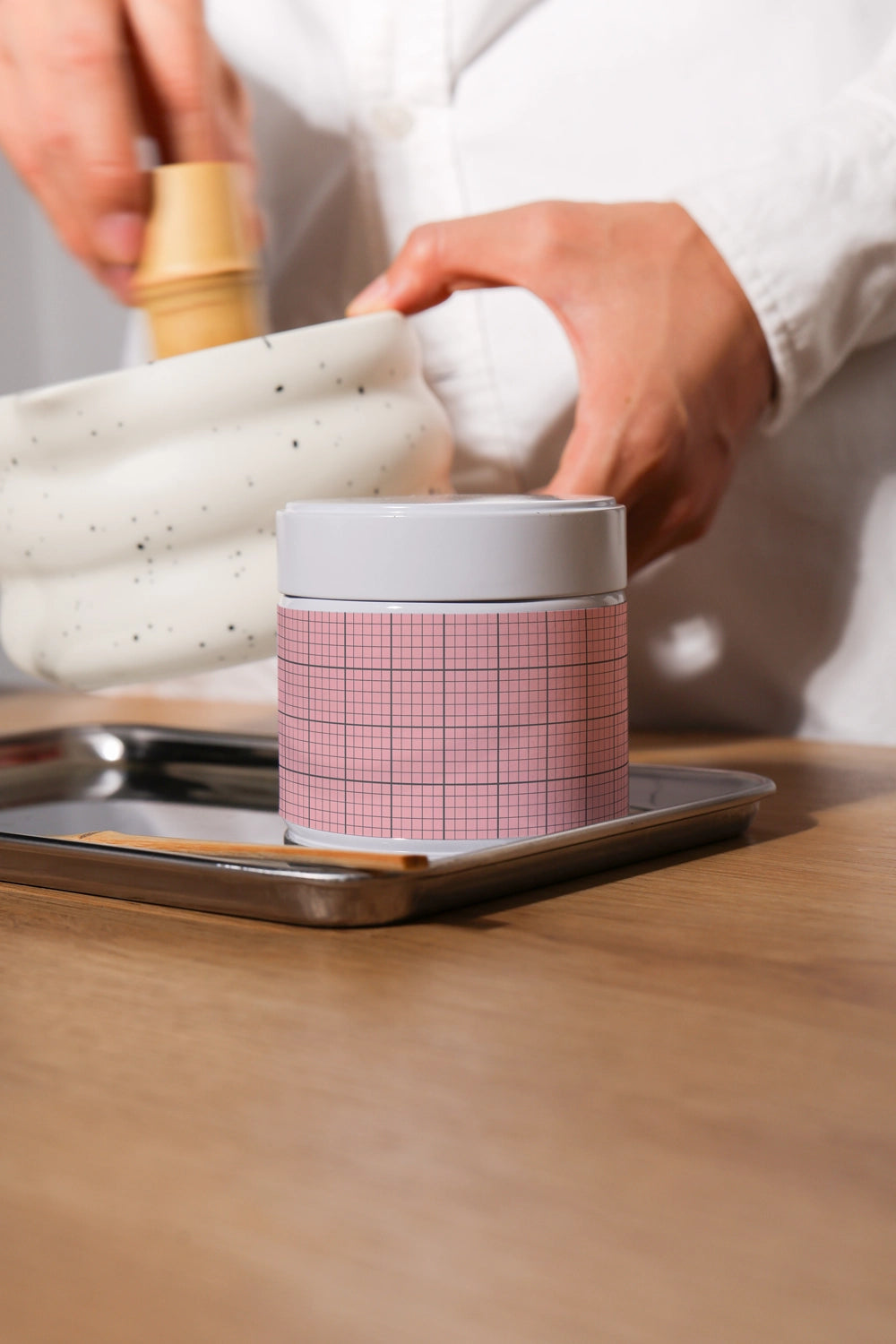 Showcase your label design with energy and focus using Matcha Powder Jar Label Mockup 04. This high-impact scene captures a realistic hand whisking matcha tea with a traditional chasen in the background, while the jar remains front and center. The motion blur adds dynamic life to the image, creating a powerful contrast between brand stillness and preparation movement.
