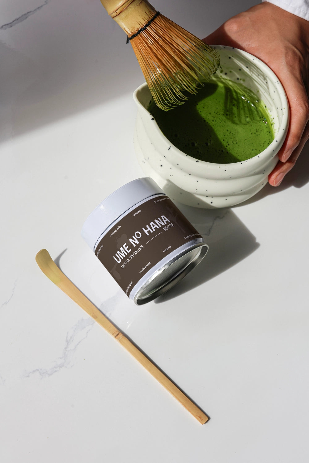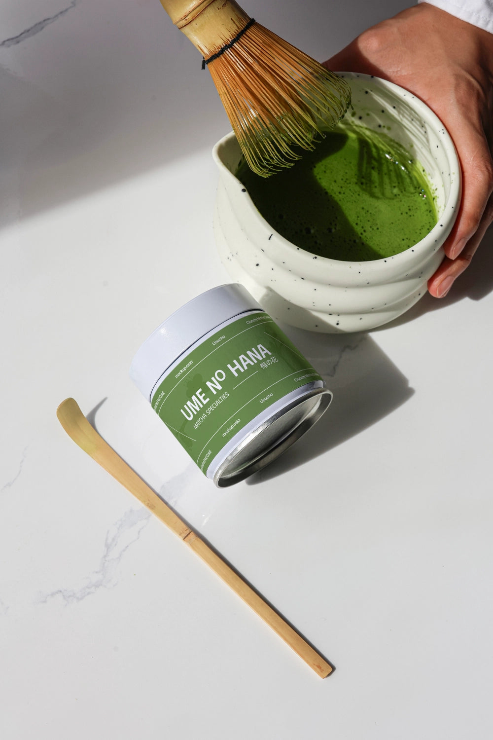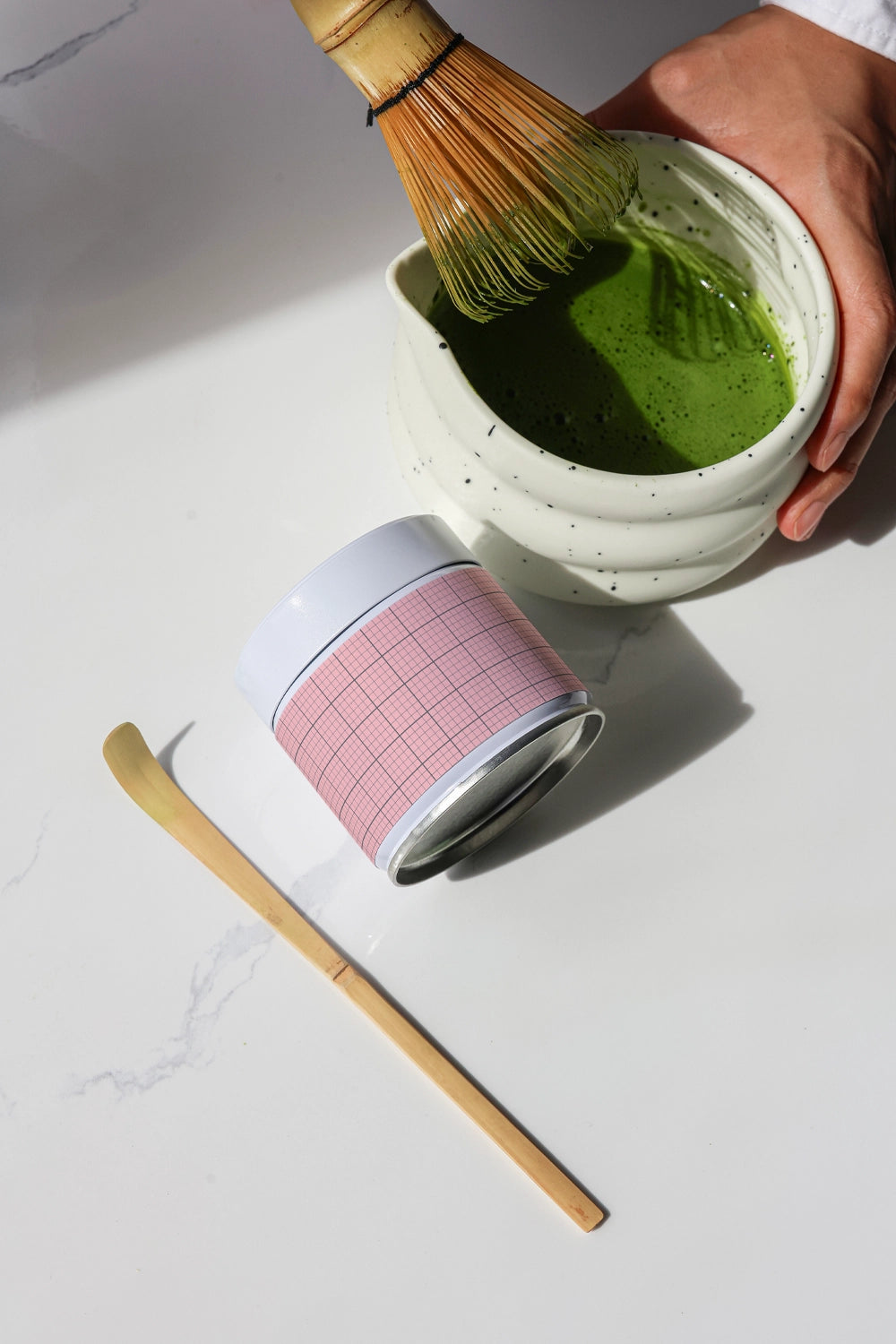 Bring your label design to life with Matcha Powder Jar Mockup MCH08, captured on a white stone tabletop with a natural barista-style vibe. The scene features a hand whisking matcha using a traditional chasen, while the jar remains the focus of attention. The combination of soft natural light and authentic preparation elements makes this mockup perfect for premium tea brands, artisan cafés, or organic product packaging.