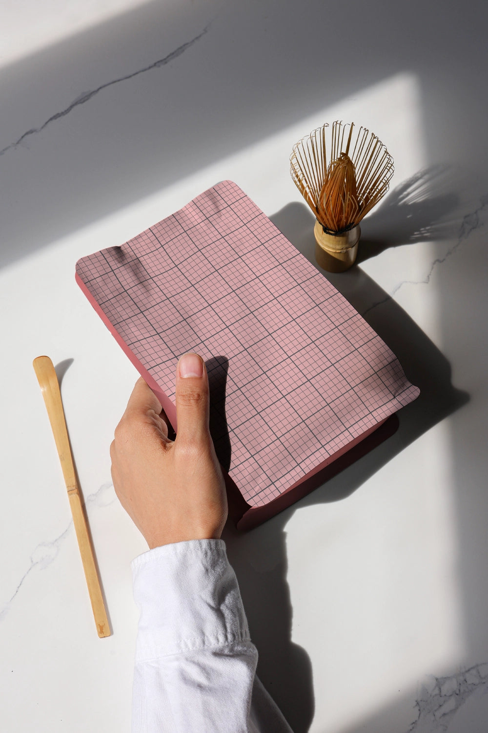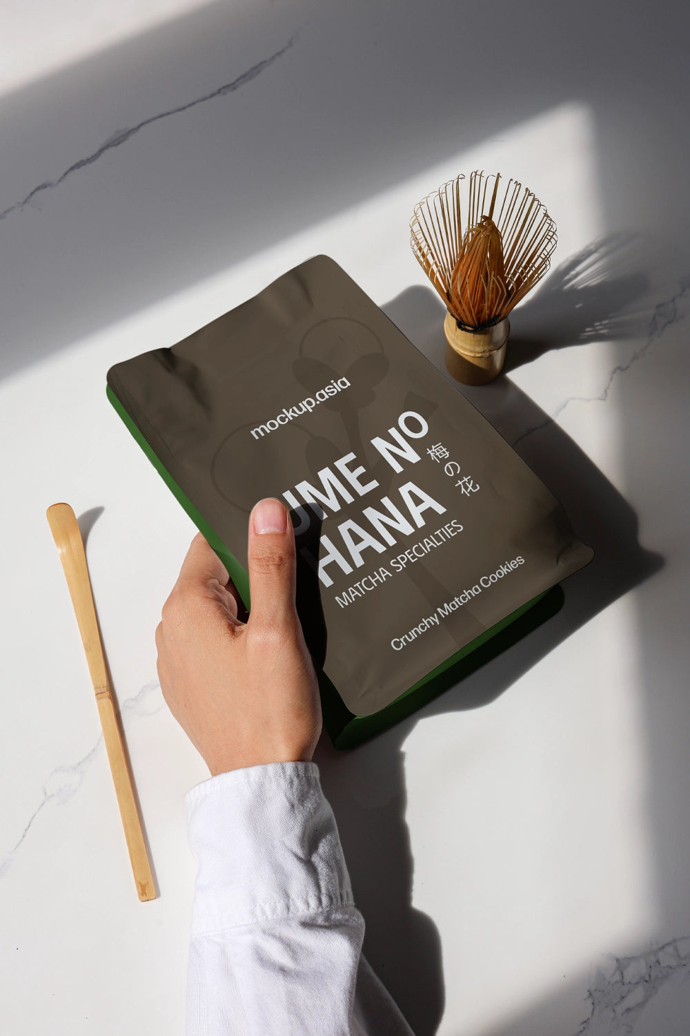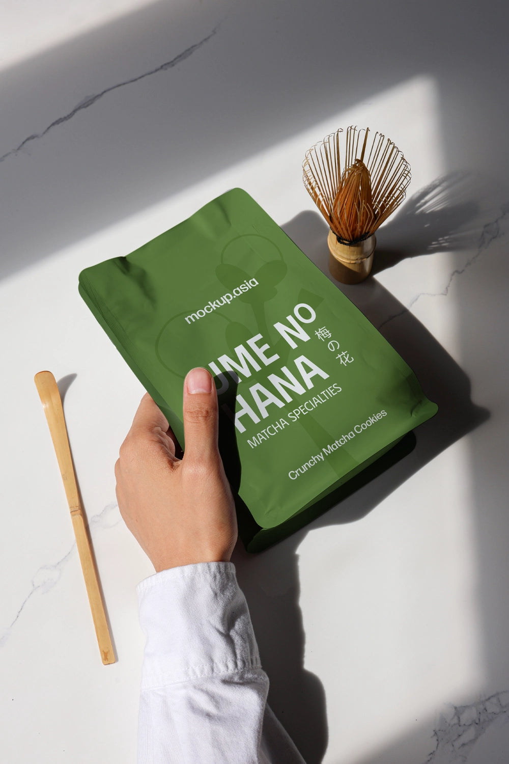 Present your matcha packaging with a serene and refined aesthetic using Matcha Zipper Bag Mockup MCH05. Captured on a clean white stone surface with soft natural light, this mockup features a gentle hand holding the pouch, accompanied by traditional matcha tools—chasen (bamboo whisk) and chashaku (bamboo scoop). Every element is placed with intention, offering an elegant yet grounded setting for your label design.