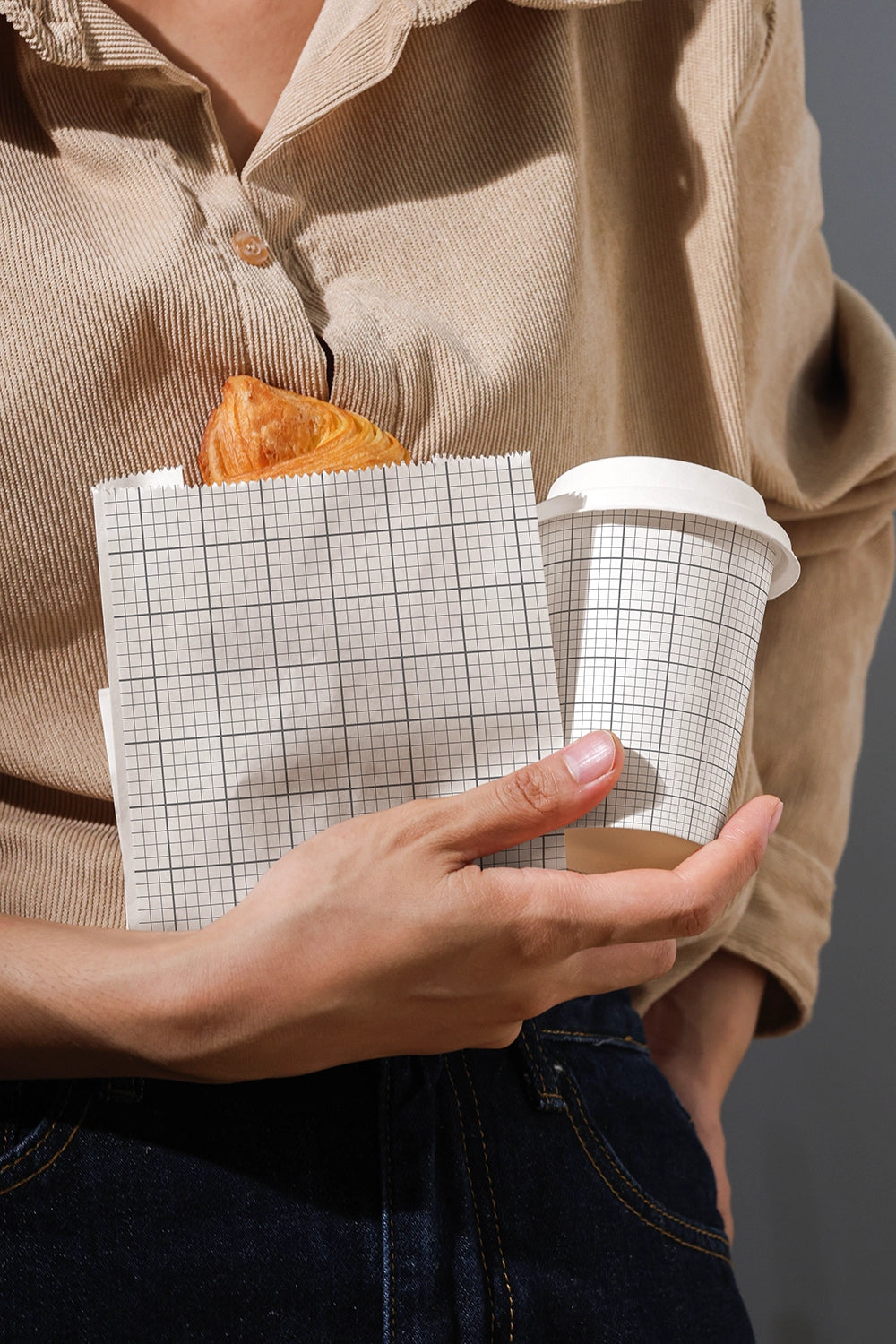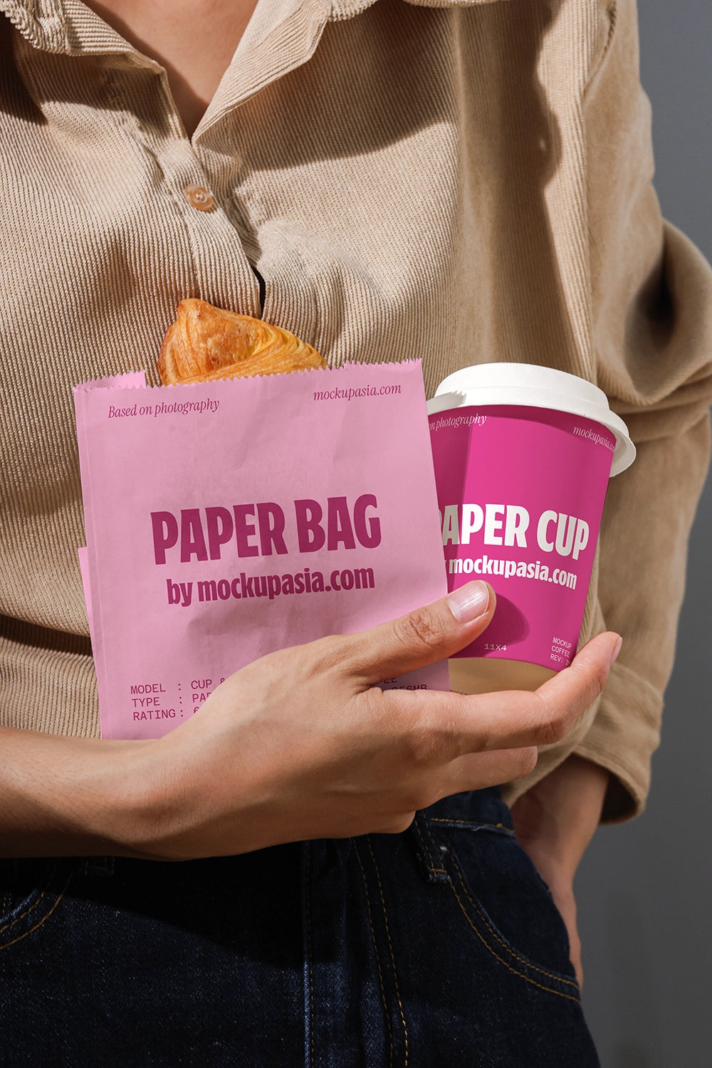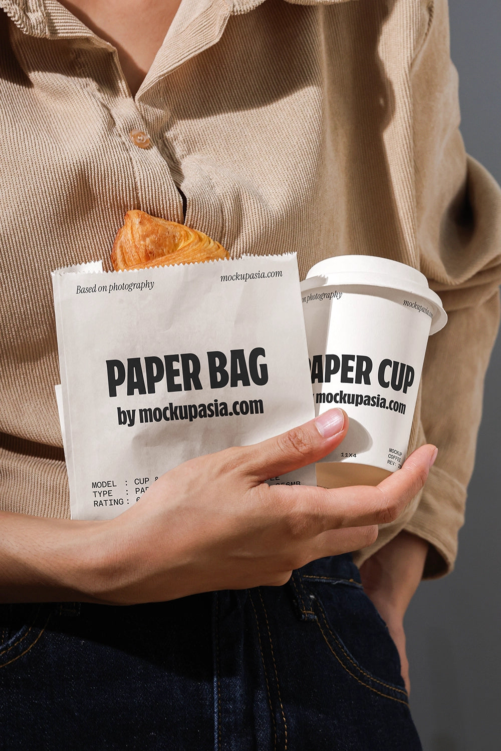 Showcase your café identity with Coffee & Croissant Set Mockup – a realistic handheld scene featuring a paper coffee cup and a kraft pastry paper bag mockup, held naturally in hand. This coffee packaging mockup captures the warmth of a true morning coffee moment, making it ideal for coffee shops, bakeries, or food packaging mockup presentations. Both items are fully editable to display your logo, pattern, or branding design.