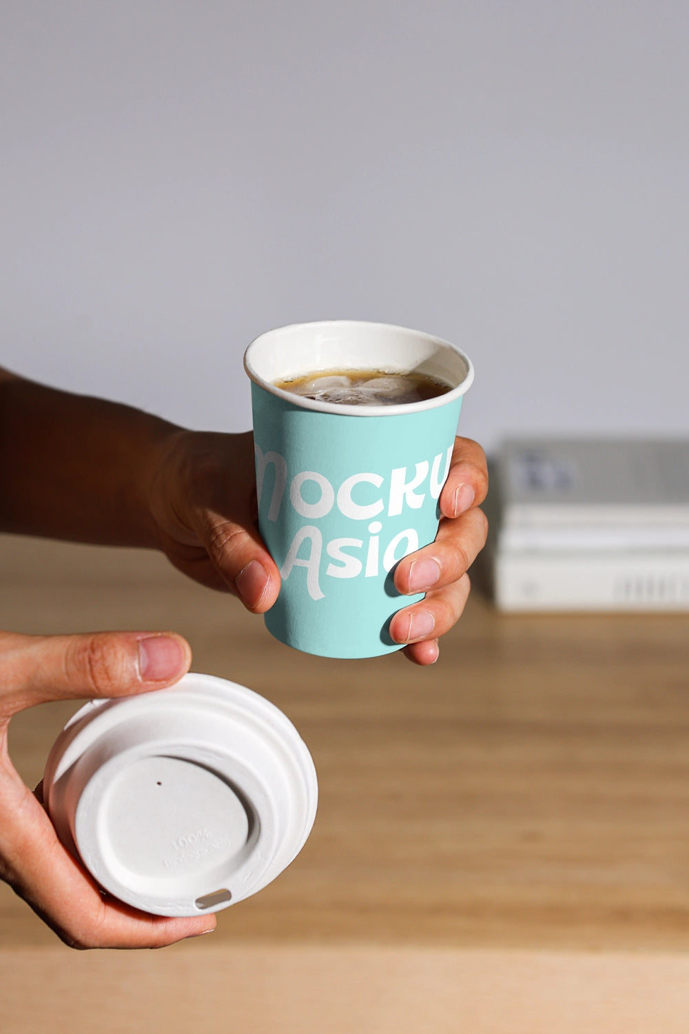 Showcase your coffee brand with precision using Paper Cup Mockup EG01 – a clean studio setup featuring a minimal espresso cup mockup. The scene captures one hand holding the cup while the other hand lifts the lid, creating a dynamic yet natural interaction that highlights both cup and lid design.