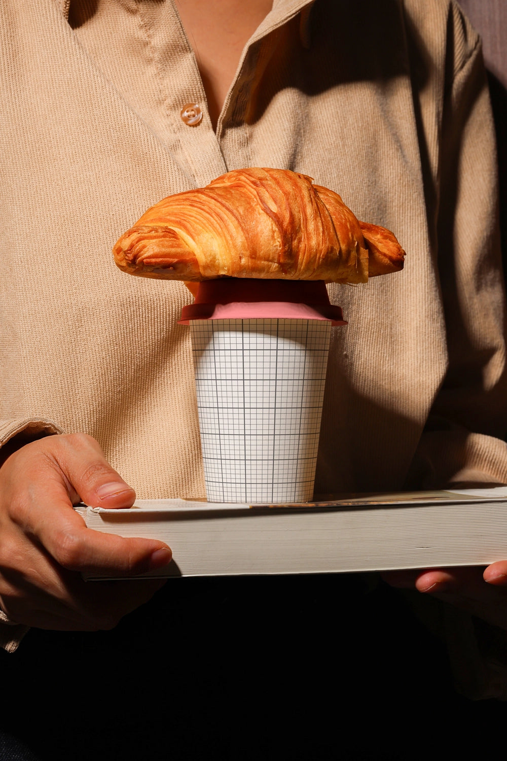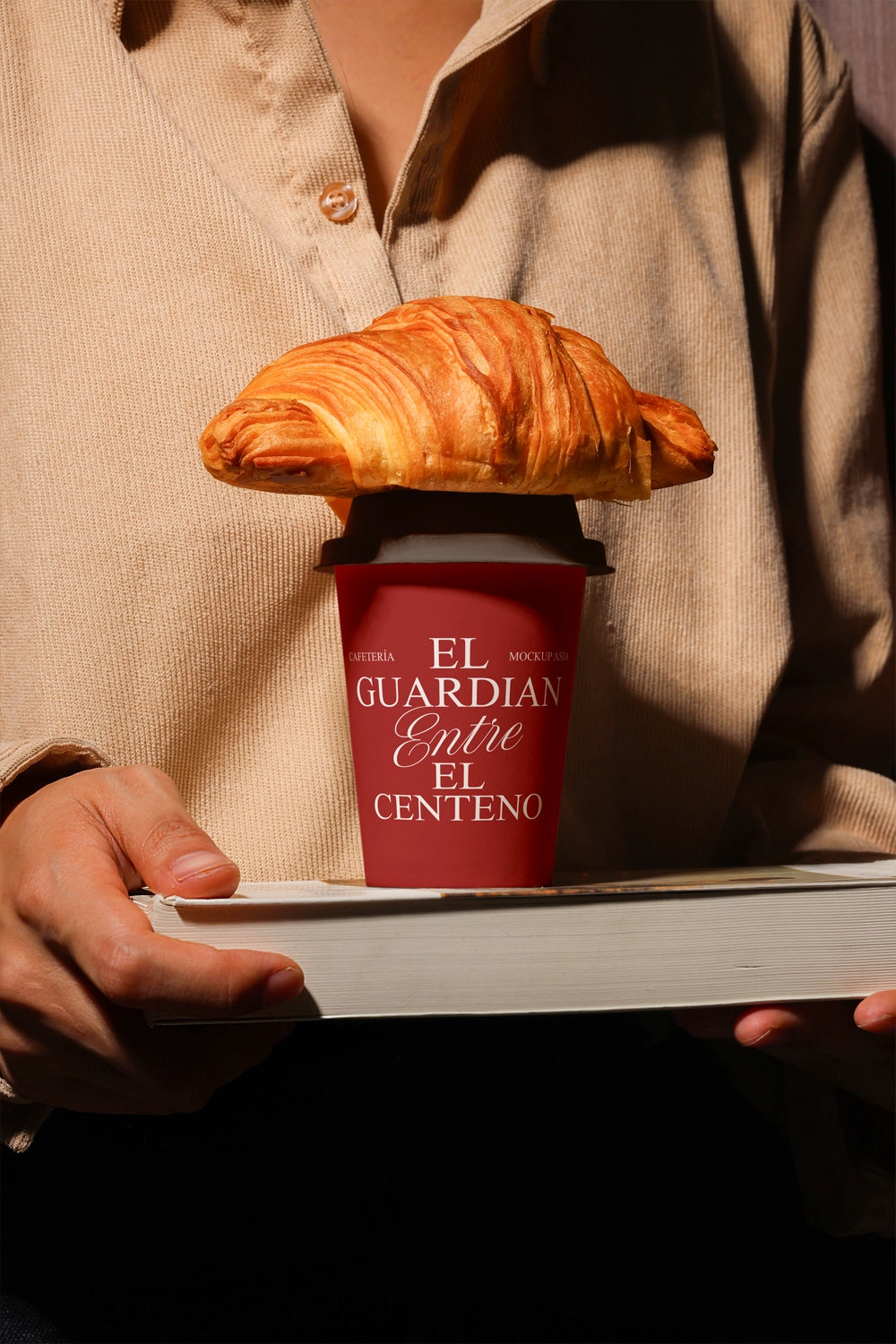 Elevate your café branding with Paper Cup Mockup EG04 – a visually striking scene where a fresh croissant rests on the cup lid, while the cup itself is carried on top of a book. Captured with dramatic contrast lighting, this coffee cup mockup adds an artistic and editorial touch to your presentation, perfect for specialty cafés or creative packaging showcases.