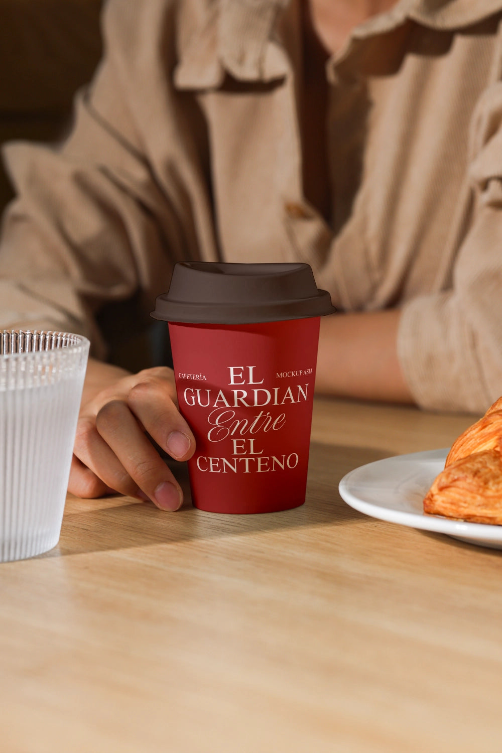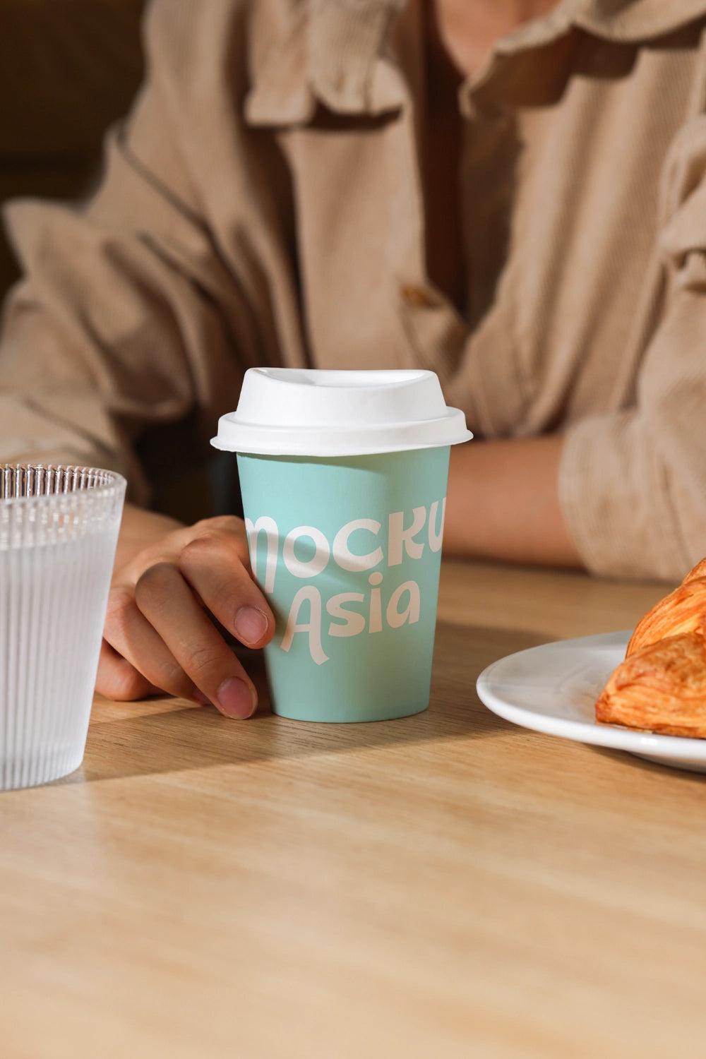 Present your café branding in style with Paper Cup Mockup EG05 – a high-quality PSD showcasing a takeaway coffee cup placed naturally on a café table. Captured with studio lighting for balanced highlights and shadows, this cup mockup lets you change both the cup body and lid color to match your brand identity.