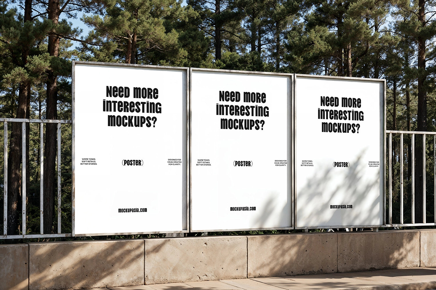 Bring your designs to life with the Poster Mockup – UP09, showcasing three posters displayed along a roadside fence surrounded by pine trees. Captured in a natural outdoor environment, the warm sunlight creates an authentic and atmospheric look that enhances any poster design. This mockup is ideal for branding, advertising campaigns, and creative presentations that seek a fresh, natural vibe.