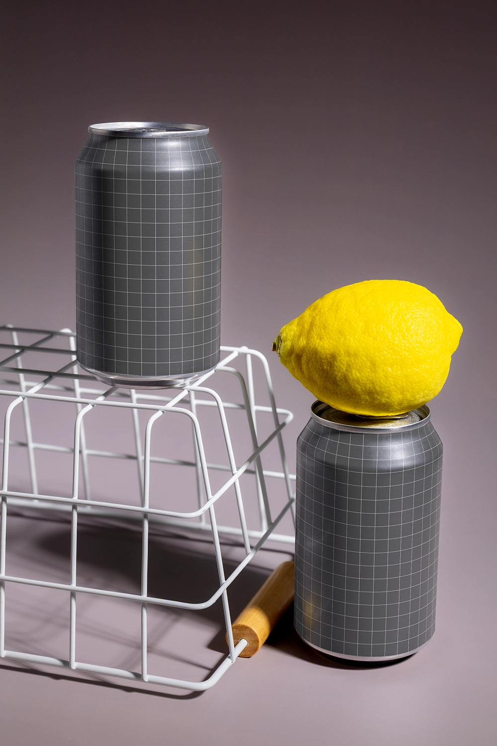 The elevated basket structure adds visual depth, while the lemon introduces a bright, organic accent that reinforces freshness and citrus flavor cues. This balanced interaction between objects, light, and shadow makes the mockup ideal for premium beverage branding, citrus soda packaging, and modern advertising visuals.