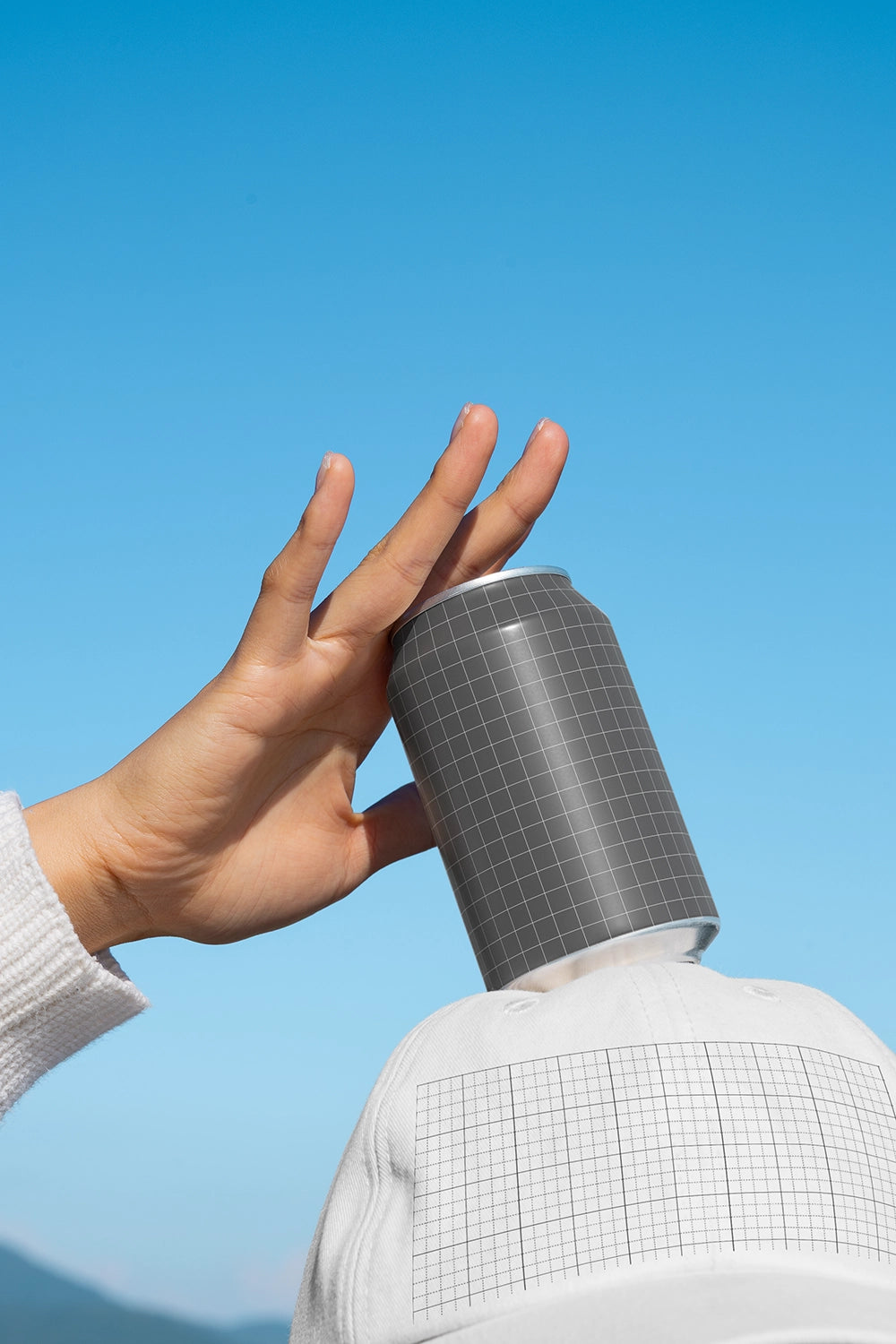 In this scene, both the soda can and the cap are fully editable, allowing you to showcase beverage branding together with headwear design in a single realistic setup. The human interaction adds scale and authenticity, making the mockup ideal for lifestyle brands, promotional campaigns, and cross-product branding visuals.
