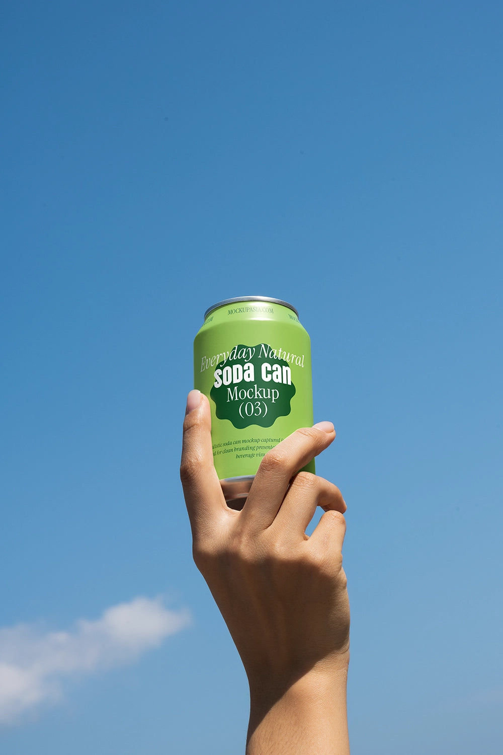 Soda Can Mockup ENS17 features a clean outdoor composition with a single soda can held up against a clear blue sky. Captured under strong natural daylight, the scene delivers crisp highlights, smooth gradients, and a bold sense of clarity that keeps full focus on the can design.