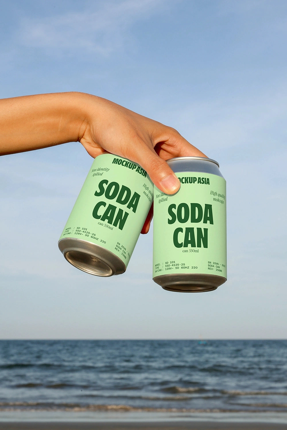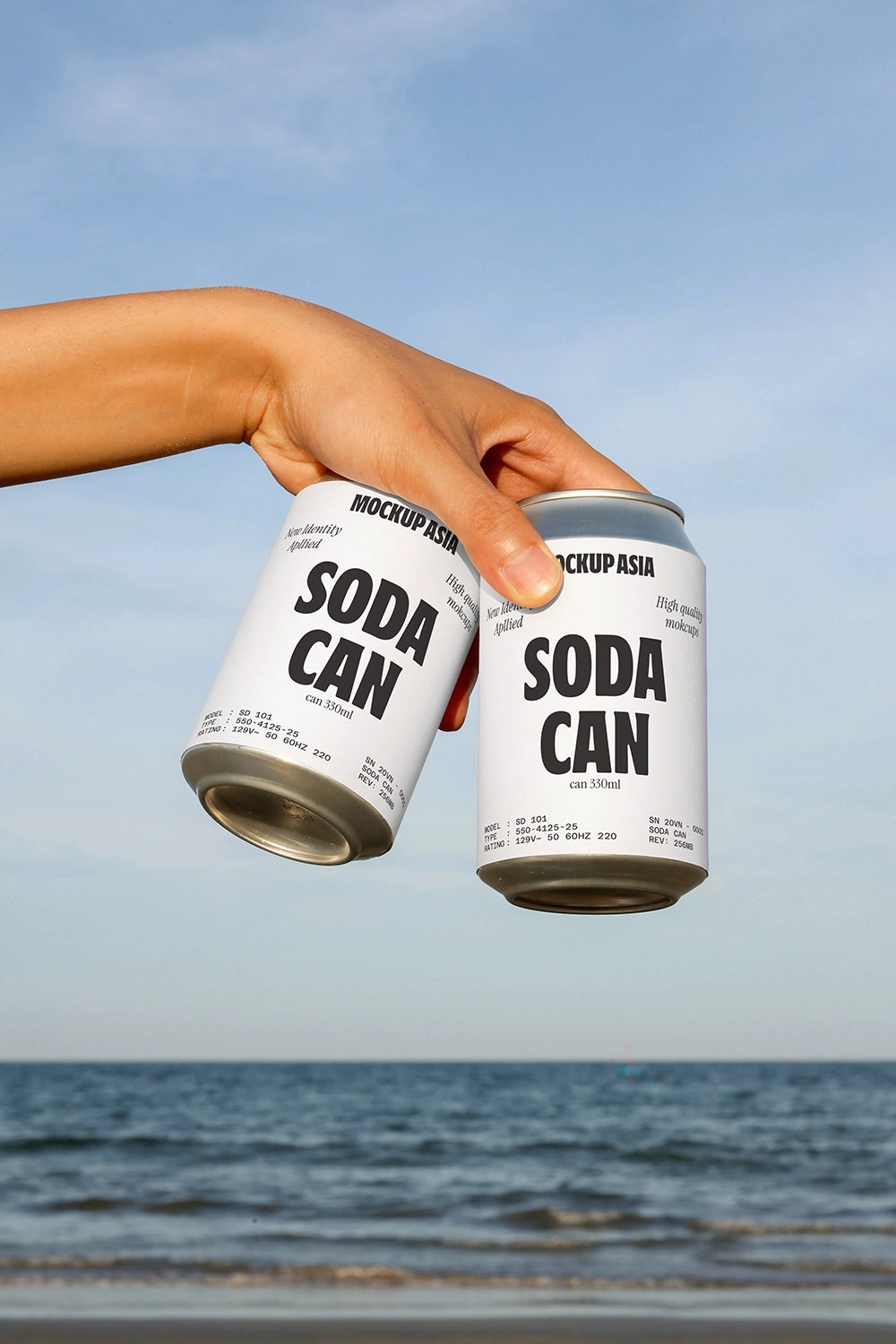 Capture the essence of summer with the SODA CAN MT05 mockup – featuring two standard 330ml soda cans held in hand, set against a stunning backdrop of turquoise ocean and clear blue sky. Bathed in natural sunlight, every detail from the can’s metallic shine to the soft highlights is rendered with crisp realism. This mockup is ideal for brands that want to evoke freshness, energy, and beachside vibes – perfect for summer campaigns, beverage promotions, or tropical-themed packaging.